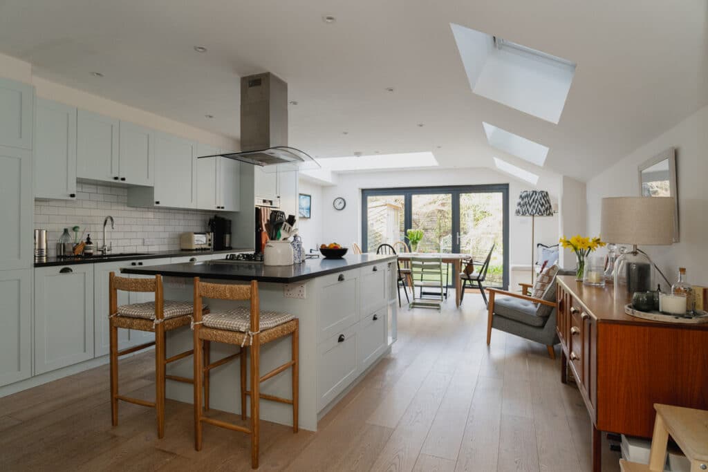 From the front bay window through to the back of the house, the ground floor offers an enormous amount of space for a Victorian terrace. The layout naturally creates four distinct zones: a comfortable living area, a children’s play space, a home-cooking kitchen, and a generous dining area.